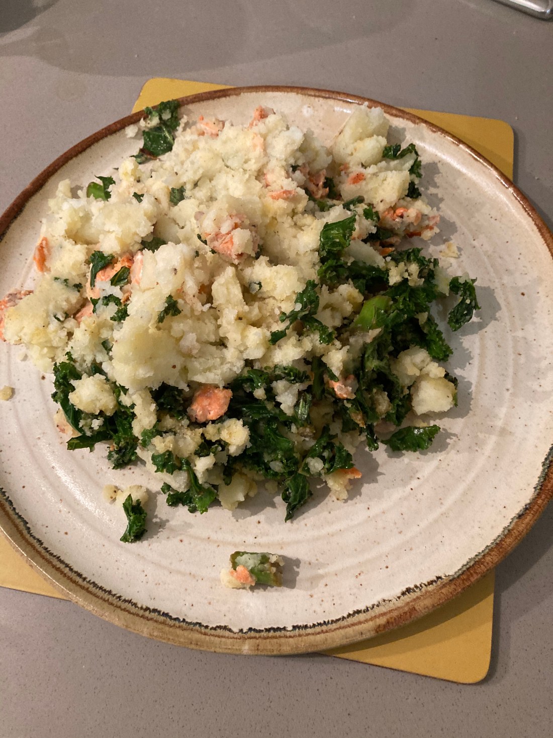 It didn’t turn out so bad after all. Finding a couple of frozen salmon filets bought when there was an offer on, a few potatoes and a bunch of kale a day or two passed its used by date, I realised I had the ingredients for Nigel Slater’s Salmon Colcannon. Dead easy, delicious, and including the time to boil the potatoes, took no more than half an hour.